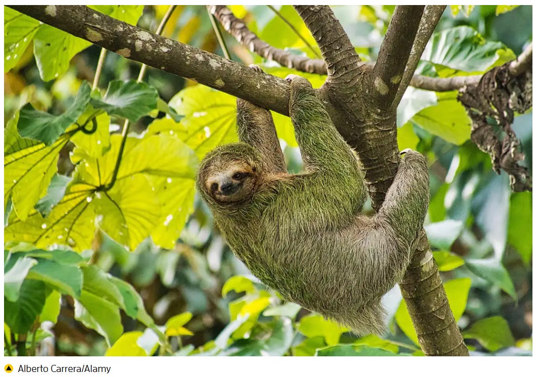 Green is NOT the rarest color – that’s obvious because chlorophyll provides such pervasive color saturation in leaves around the planet. However, I did discover that no mammals appear green because they (we) lack the ability to produce green pigment. Snakes, birds, and even fish can, but not us mammals. Sometimes sloths appear green, but that’s due to algae growing in their fur.